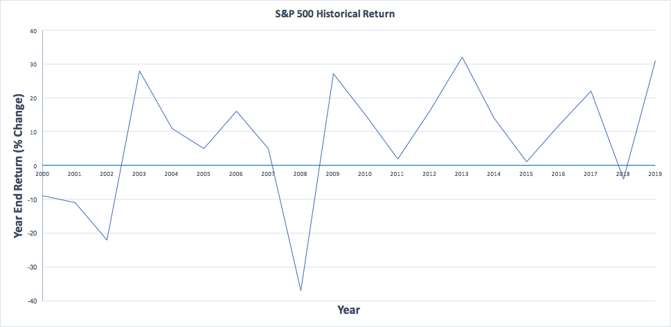 Although the total return for the 20 year period is about 6%, in any given year, the year-end return is all over the place. 2017 and 2018 are perfect examples. In 2017, the year-end return of the S&P 500 was about 22%, while for 2018, it was around -3.5%. While the stock market trends in the upward direction, it doesn’t do so in a straight line, but more like a fitful seismometer.