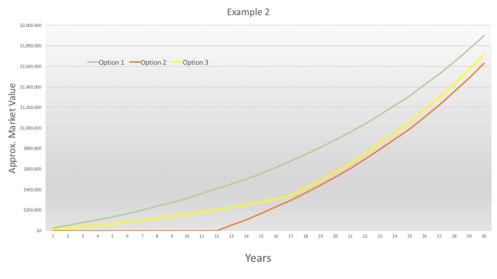 The results are mixed here, but you see fairly clearly that Option 1 nets the highest return. Instead of using money you pay down a 4% obligation, you’re investing money and gaining 6% on it. Of course I have to mention that these calculations are highly approximate. There’s so many variables to keep in mind like the fact that interest payments on a loan may reduce your taxes, while keeping an investment account may increase your taxes. It may also be unreasonable to assume that your income will permit you the same contribution every month for 30 years. Also keep in mind for options 2 and 3 that due to the shorter investment term, the assumed net average return of 6% is likely to be much more variable.