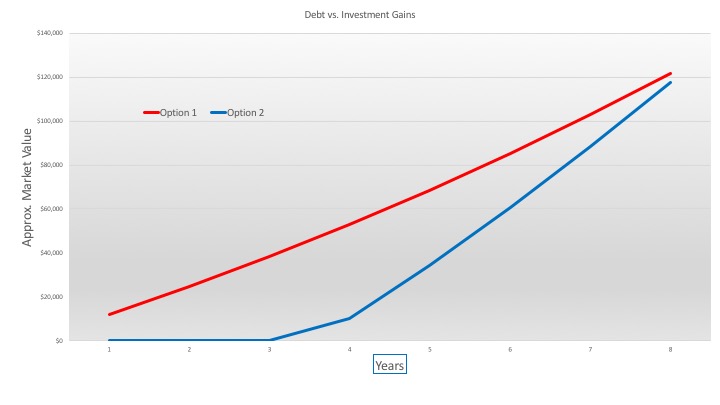 In these scenarios, the results are about the same, mostly owing to the fact that the interest rate on the loan is about the same as the assumed rate of return on investment. But, there are some caveats, especially in scenario 2. The 6% assumed rate of return in the market might not be realistic over such a short time frame – a dip or an upswing in one of those years might not even out, drastically altering the results. But in the end, you do see how investing for longer results in a larger market value at the end of the time period, even though you also paid more interest on the loan.