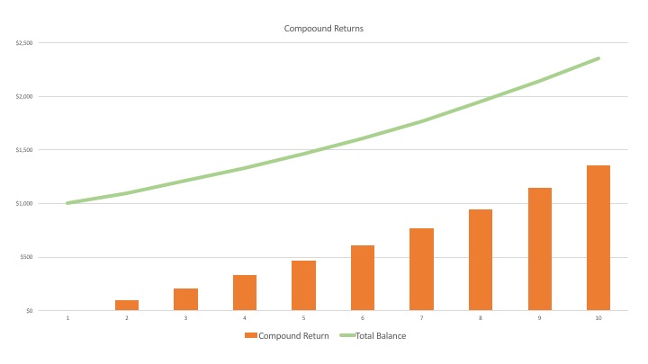 Let’s start with the basic concept of “principal,” which is the money that you invest. If you take $1,000 from your paycheck and invest it in some sort of account or asset, then your principal is $1,000. Compounding means that, as the years go by, your returns are earned not just on your principal, but also on any money that has previously been earned on your principal. An example does the most justice.