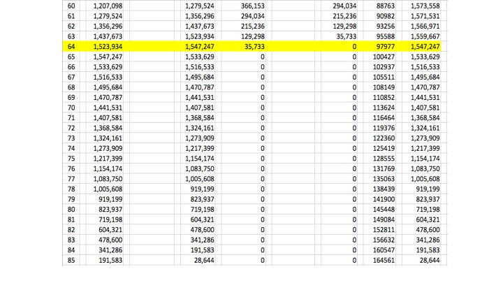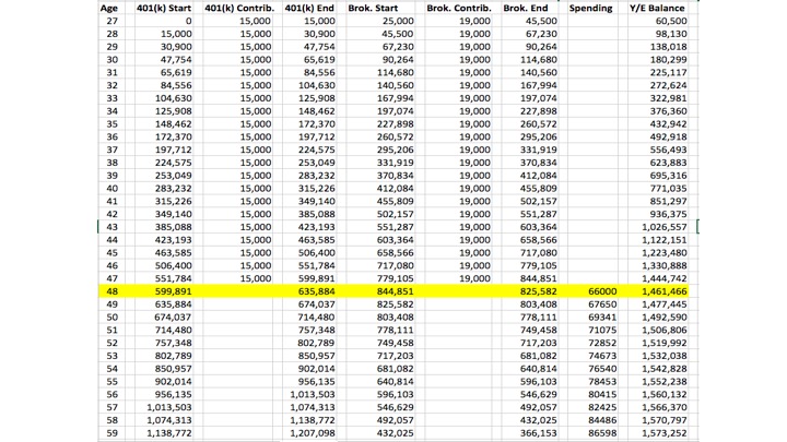 In this example, the FIRE investor retires at 48 with savings of $1,444,742 (the ending market value at age 47), and starts spending $66,000 per year. The brokerage account has sufficient funds to make it until age 64, meaning that the FIRE retiree does not need to dip into the 401(k) before 59 ½, avoiding early withdrawal penalties. At age 64, our retiree starts deducting from the 401(k) and makes it to age 85 before funds are too low to meet anticipated spending.